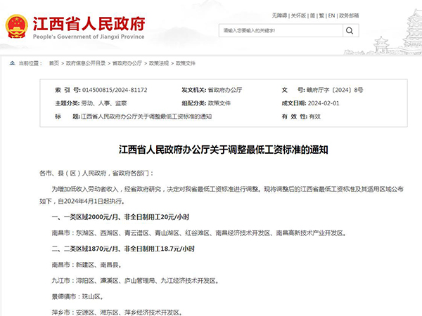 《江西省人民政府办公厅关于调整最低工资标准通知》公布,从2024年4月1日 起执行,调整后的江西省最低工资标准及其适用区域,一起来看看吧!江西省人民政府办公厅关于调整最低工资标准的通知各市、县(区)人民政府,省政府各部门READ MORE...